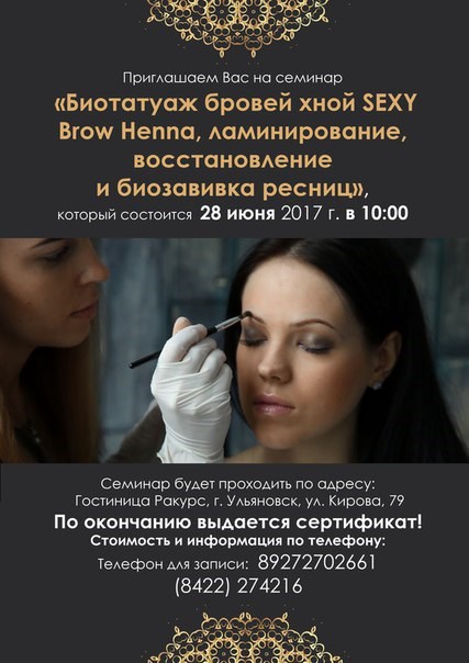 Дорогие друзья! Приглашаем Вас на обзорный семинар по продукции Sexy Brow Henna, который состоится 28 июня в г. Ульяновске.